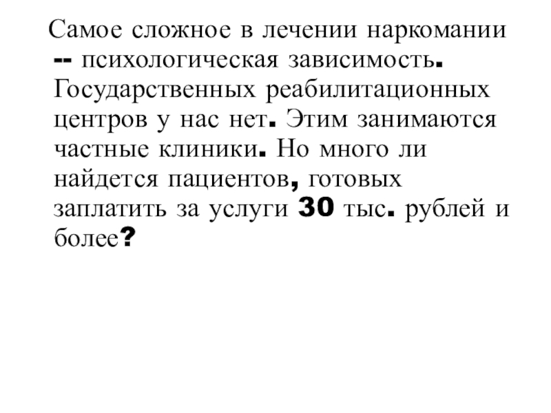 Слайд 16 Самое сложное в лечении наркомании -- психологическая зависимость. Государственных реабилитационных
