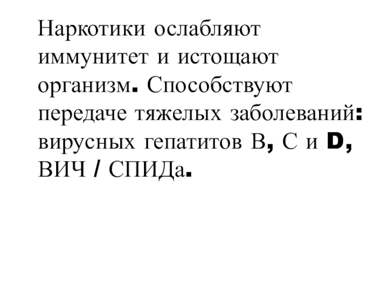 Слайд 11 Наркотики ослабляют иммунитет и истощают организм. Способствуют передаче тяжелых
