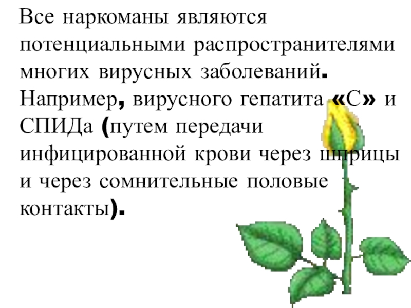 Слайд 6 Все наркоманы являются потенциальными распространителями многих вирусных заболеваний. Например, вирусного