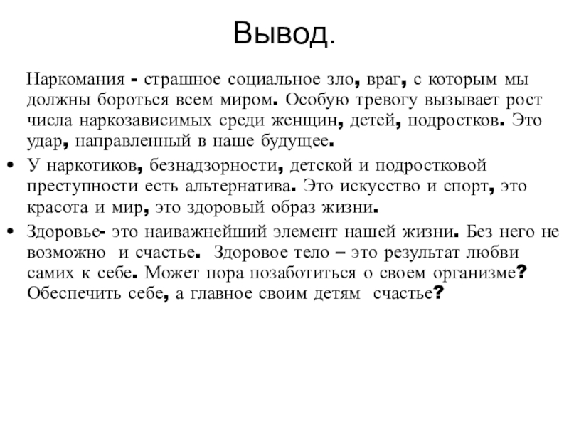 должны бороться всем миром. Особую тревогу вызывает рост числа наркозависимых среди женщин, детей, подростков. Это удар, направленный в наше будущее.