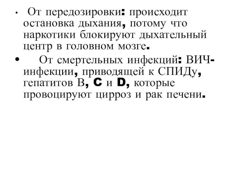 Слайд 13 От передозировки: происходит остановка дыхания, потому что наркотики блокируют дыхательный
