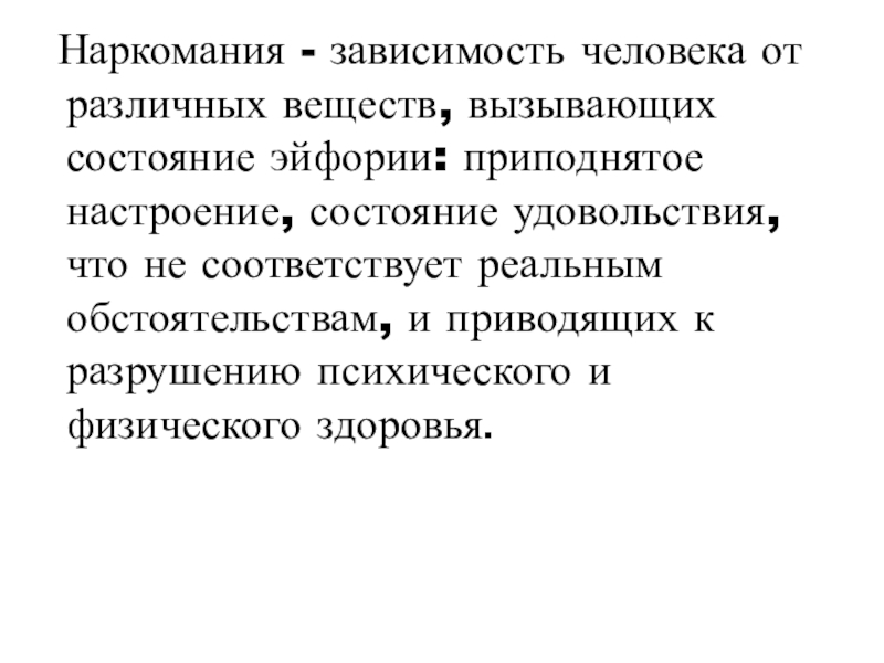Слайд 7 Наркомания - зависимость человека от различных веществ, вызывающих состояние