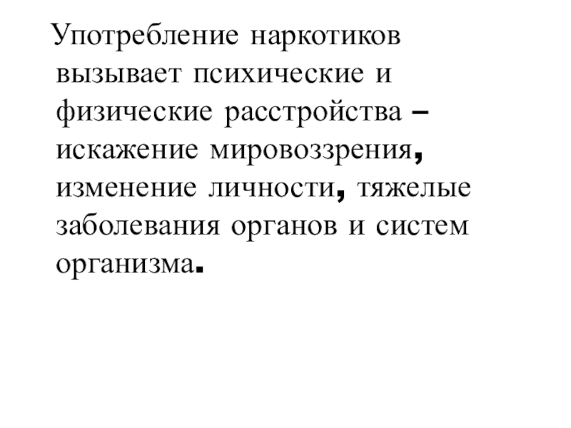 Слайд 8 Употребление наркотиков вызывает психические и физические расстройства – искажение