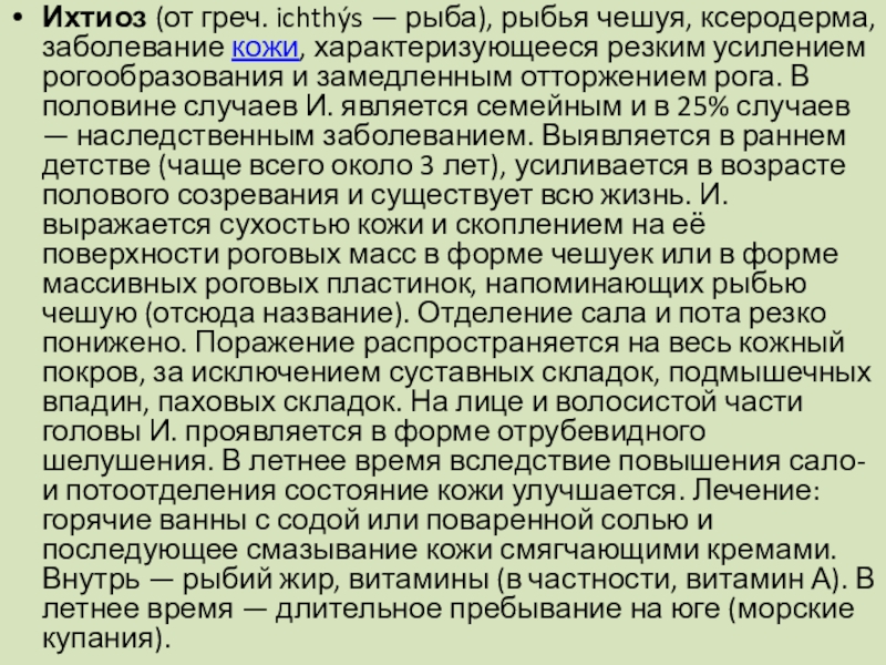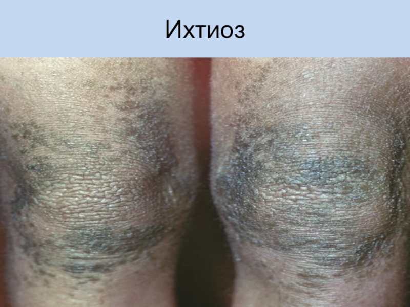 Слайд 10Ихтиоз (от греч. ichthýs — рыба), рыбья чешуя, ксеродерма, заболевание кожи, характеризующееся резким
