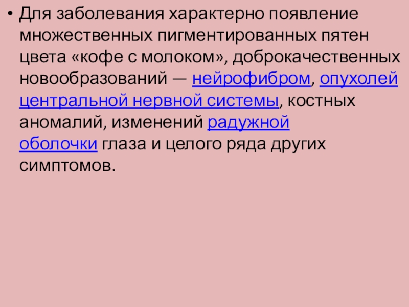 Слайд 8Для заболевания характерно появление множественных пигментированных пятен цвета «кофе с молоком»,