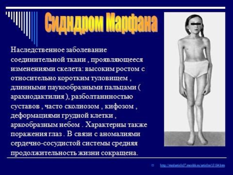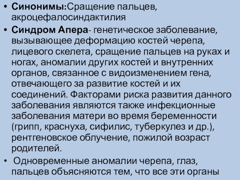 скелета, сращение пальцев на руках и ногах, аномалии других костей и внутренних органов, связанное с видоизменением гена, отвечающего за развитие костей и их соединений. Факторами риска развития данного заболевания являются также инфекционные заболевания матери во время беременности (грипп, краснуха, сифилис, туберкулез и др.), рентгеновское облучение, пожилой возраст родителей.