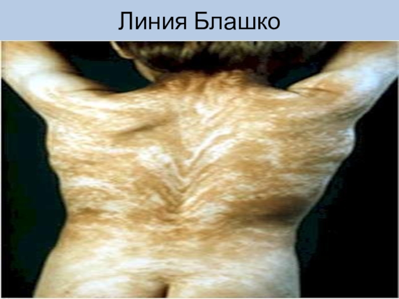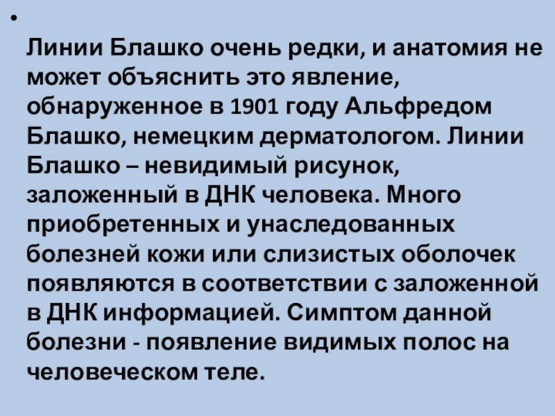обнаруженное в 1901 году Альфредом Блашко, немецким дерматологом. Линии Блашко – невидимый рисунок, заложенный в ДНК человека. Много приобретенных и унаследованных болезней кожи или слизистых оболочек появляются в соответствии с заложенной в ДНК информацией. Симптом данной болезни - появление видимых полос на человеческом теле.