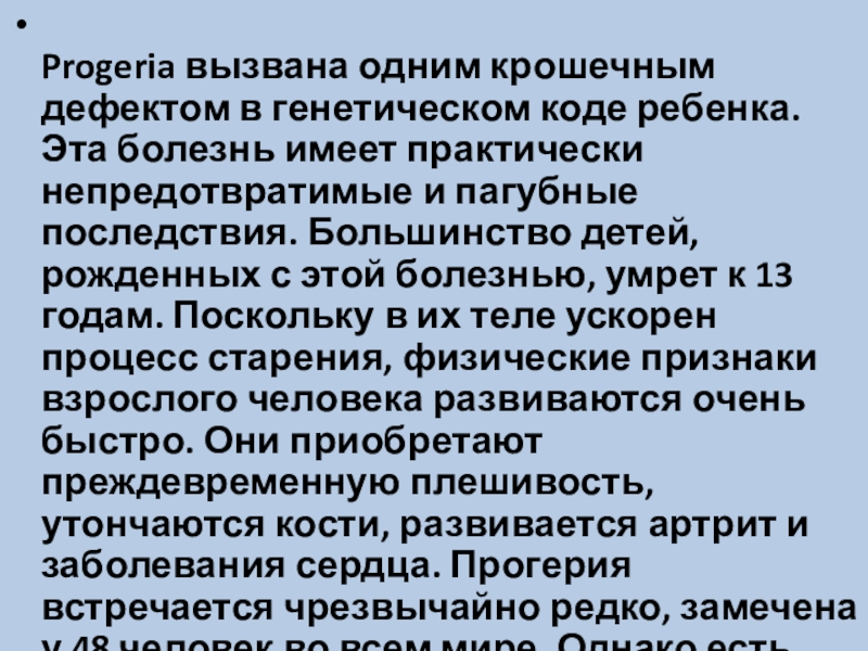 имеет практически непредотвратимые и пагубные последствия. Большинство детей, рожденных с этой болезнью, умрет к 13 годам. Поскольку в их теле ускорен процесс старения, физические признаки взрослого человека развиваются очень быстро. Они приобретают преждевременную плешивость, утончаются кости, развивается артрит и заболевания сердца. Прогерия встречается чрезвычайно редко, замечена у 48 человек во всем мире. Однако есть одно семейство, в котором пять детей имеет данный диагноз.
