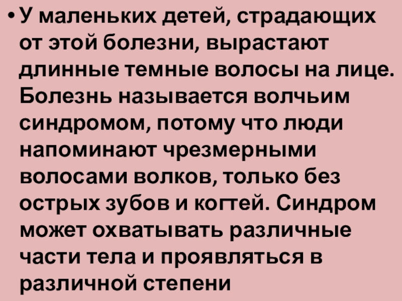 на лице. Болезнь называется волчьим синдромом, потому что люди напоминают чрезмерными волосами волков, только без острых зубов и когтей. Синдром может охватывать различные части тела и проявляться в различной степени
