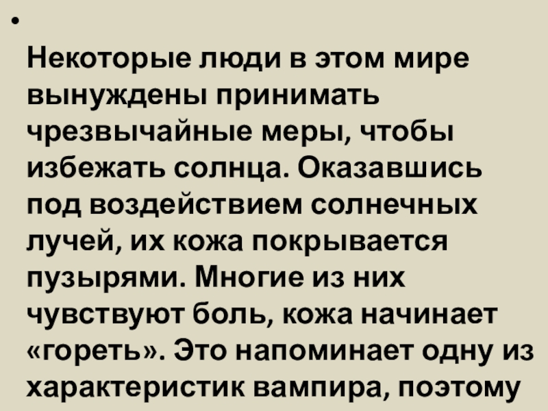 солнца. Оказавшись под воздействием солнечных лучей, их кожа покрывается пузырями. Многие из них чувствуют боль, кожа начинает «гореть». Это напоминает одну из характеристик вампира, поэтому болезнь получила такое название.
