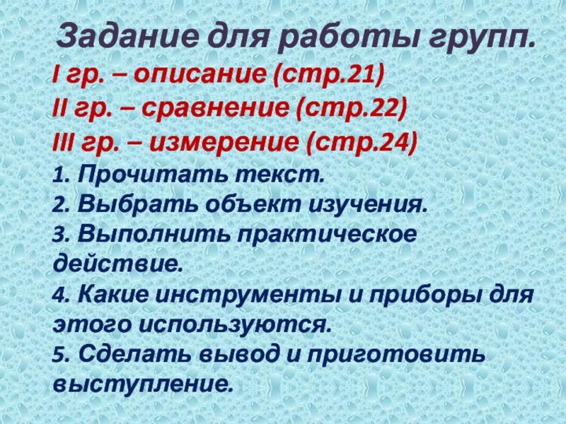 Задание для работы групп.I гр. – описание (стр.21)II гр. – сравнение (стр.22)III гр. – измерение (стр.24)1. Прочитать