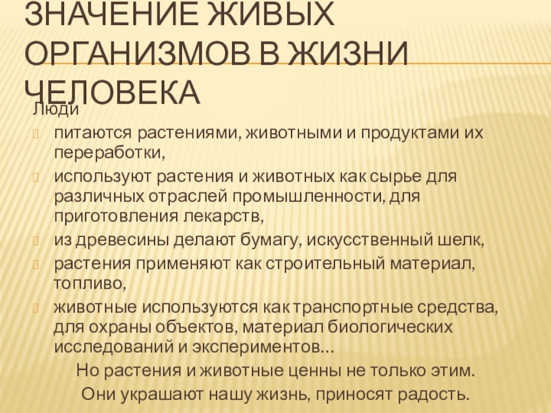 Значение живых организмов в жизни человекаЛюди питаются растениями, животными и продуктами их переработки, используют растения и животных