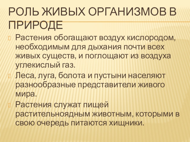 Роль живых организмов в природеРастения обогащают воздух кислородом, необходимым для дыхания почти всех живых существ, и поглощают