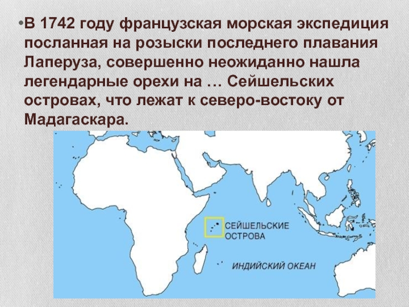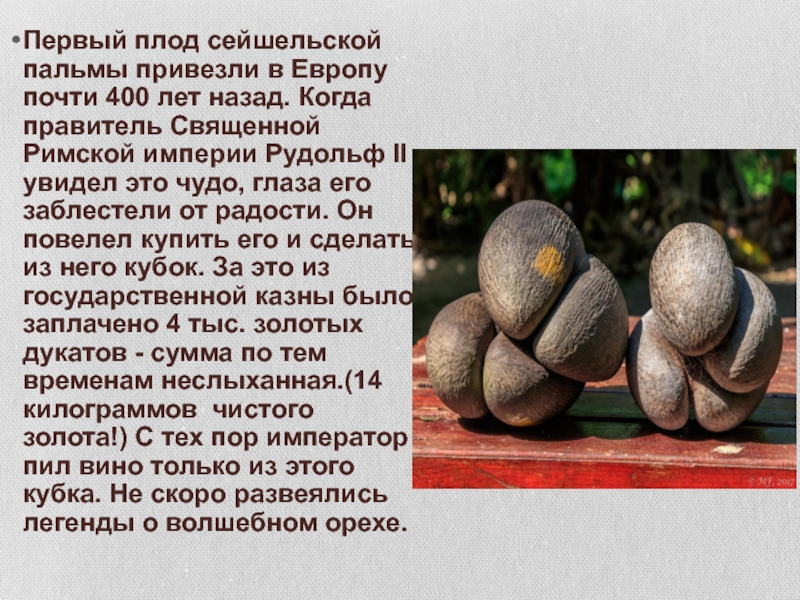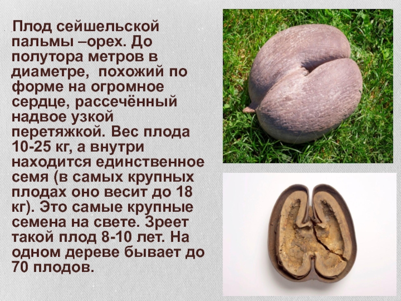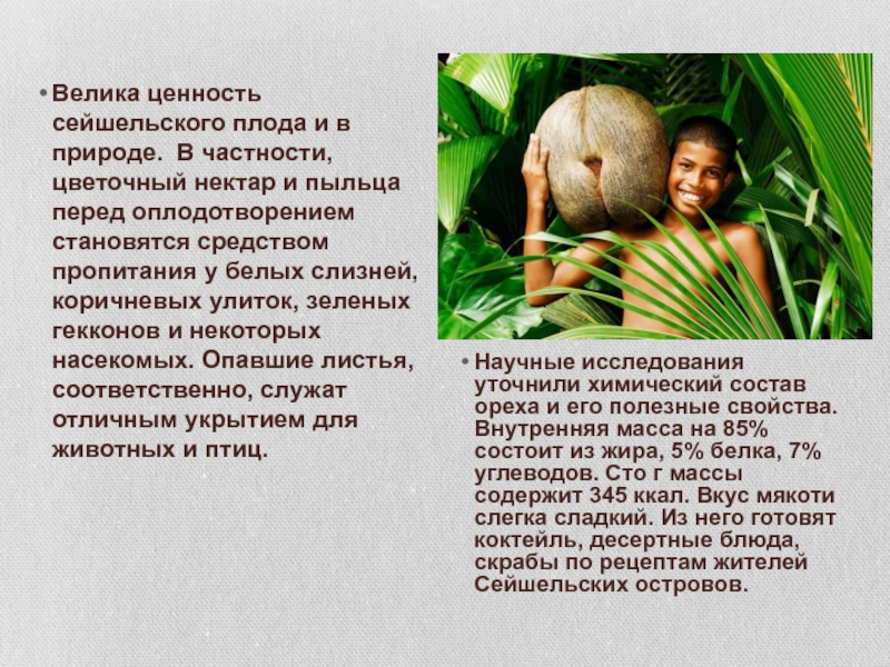 Научные исследования уточнили химический состав ореха и его полезные свойства. Внутренняя масса на 85% состоит из жира, 5% белка, 7% углеводов. Сто г массы содержит 345 ккал. Вкус мякоти слегка сладкий. Из него готовят коктейль, десертные блюда, скрабы по рецептам жителей Сейшельских островов.