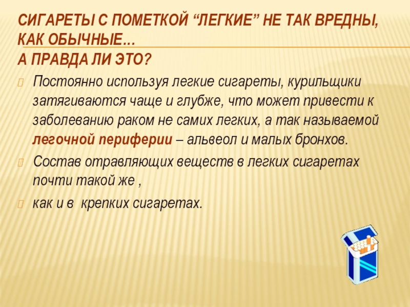 Постоянно используя легкие сигареты, курильщики затягиваются чаще и глубже, что может привести к заболеванию раком не самих легких, а так называемой легочной периферии – альвеол и малых бронхов.