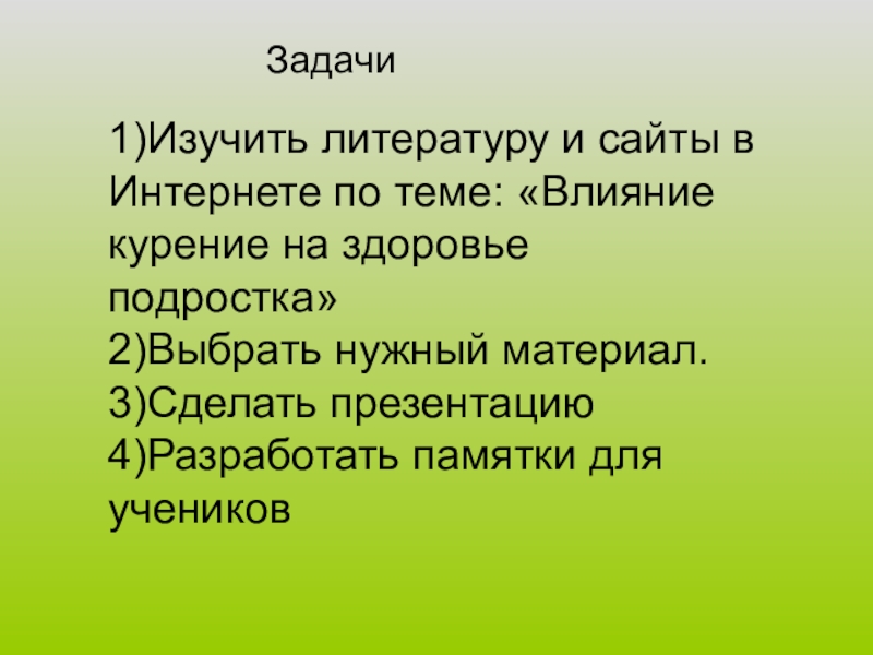 1)Изучить литературу и сайты в Интернете по теме: «Влияние курение на