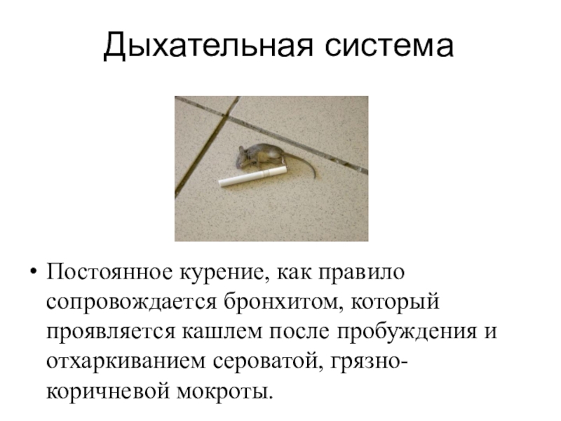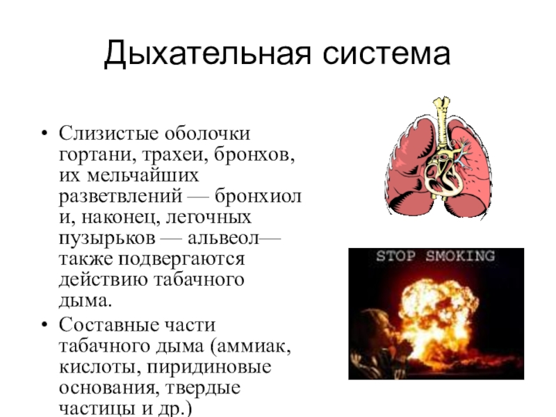 Составные части табачного дыма (аммиак, кислоты, пиридиновые основания, твердые частицы и др.) раздражают слизистые оболочки легких.