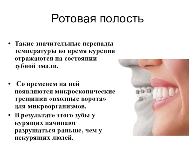 В результате этого зубы у курящих начинают разрушаться раньше, чем у некурящих людей.