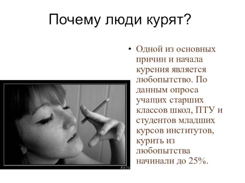 По данным опроса учащих старших классов школ, ПТУ и студентов младших курсов институтов, курить из любопытства начинали до 25%.