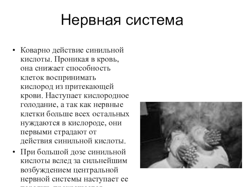 Коварно действие синильной кислоты. Проникая в кровь, она снижает способность