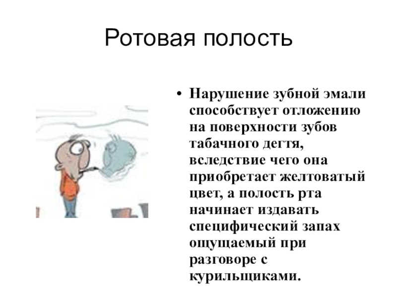 вследствие чего она приобретает желтоватый цвет, а полость рта начинает издавать специфический запах ощущаемый при разговоре с курильщиками.