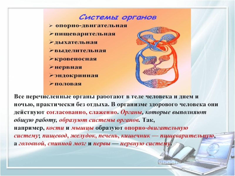 практически без отдыха. В организме здорового человека они действуют согласованно, слаженно. Органы, которые выполняют общую работу, образуют системы органов. Так, например, кости и мышцы образуют опорно-двигательную систему; пищевод, желудок, печень, кишечник — пищеварительную, а головной, спинной мозг и нервы — нервную систему.
