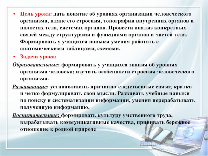 Цель урока: дать понятие об уровнях организации человеческого организма, плане его строения, топографии внутренних органов и полостях тела, системах органов. Провести анализ конкретных связей между структурами и функциями органов и частей тела. Формировать у учащихся навыки