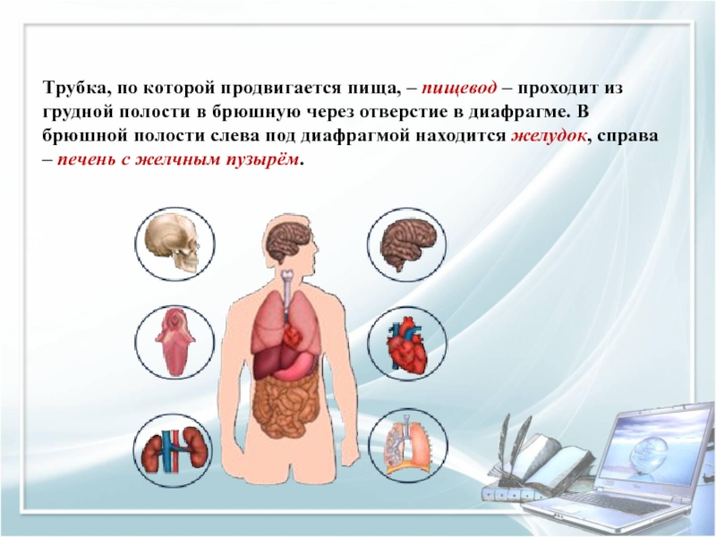 Слайд 10Трубка, по которой продвигается пища, – пищевод – проходит из грудной полости в