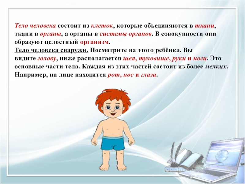 органов. В совокупности они образуют целостный организм. Тело человека снаружи. Посмотрите на этого ребёнка. Вы видите голову, ниже располагается шея, туловище, руки и ноги. Это основные части тела. Каждая из этих частей состоит из более мелких. Например, на лице находится рот, нос и глаза.