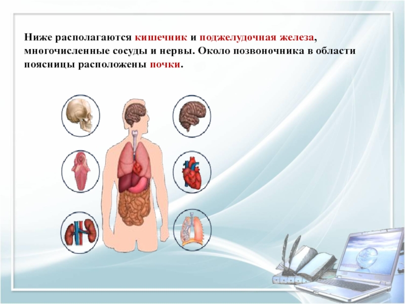 Слайд 9 Ниже располагаются кишечник и поджелудочная железа, многочисленные сосуды и нервы. Около