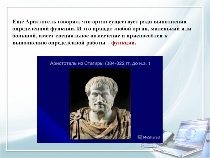 Слайд 6Ещё Аристотель говорил, что орган существует ради выполнения определённой функции. И