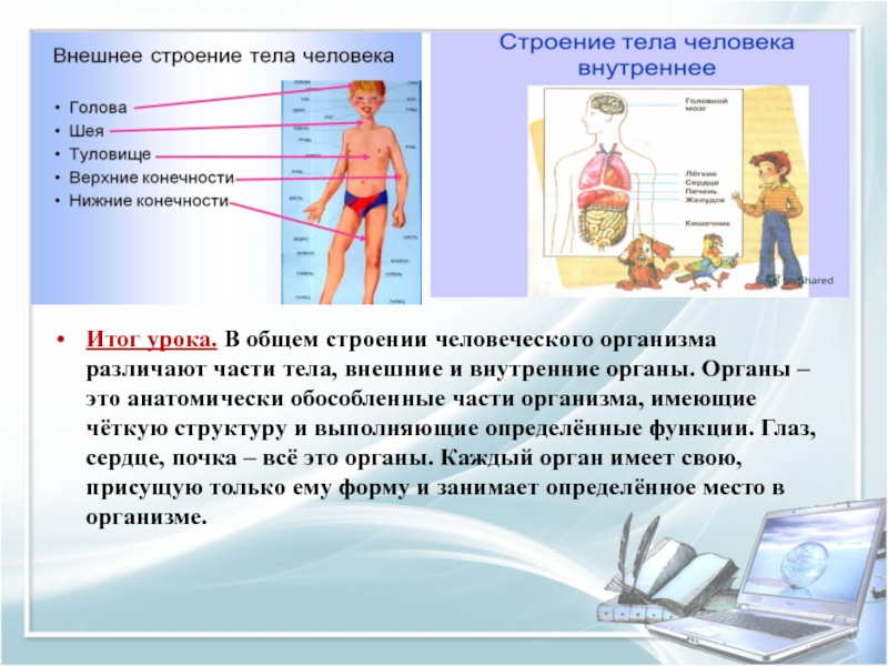 Итог урока. В общем строении человеческого организма различают части тела, внешние и внутренние органы. Органы – это анатомически
