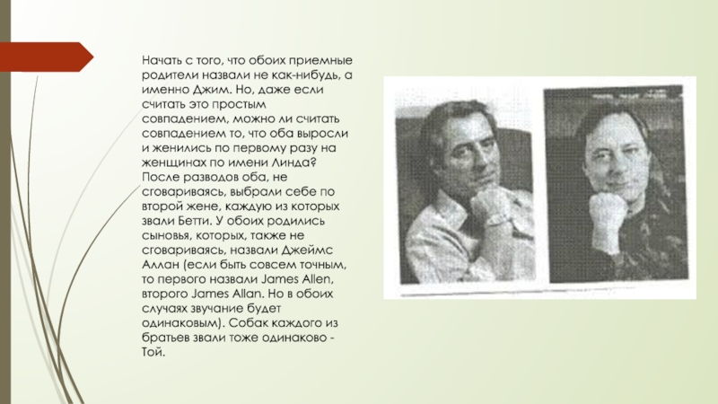 именно Джим. Но, даже если считать это простым совпадением, можно ли считать совпадением то, что оба выросли и женились по первому разу на женщинах по имени Линда? После разводов оба, не сговариваясь, выбрали себе по второй жене, каждую из которых звали Бетти. У обоих родились сыновья, которых, также не сговариваясь, назвали Джеймс Аллан (если быть совсем точным, то первого назвали James Allen, второго James Allan. Но в обоих случаях звучание будет одинаковым). Собак каждого из братьев звали тоже одинаково - Той.