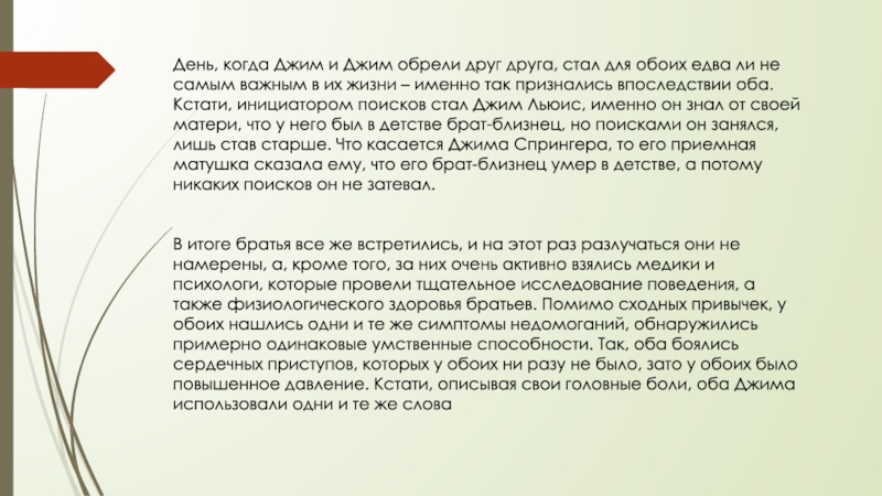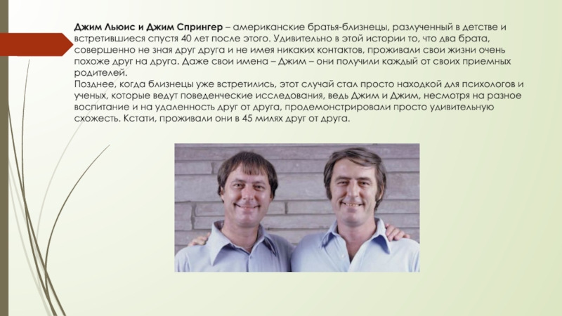 Слайд 2Джим Льюис и Джим Спрингер – американские братья-близнецы, разлученный в детстве