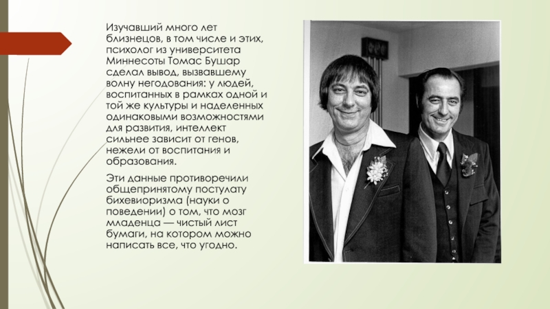 Слайд 6Изучавший много лет близнецов, в том числе и этих, психолог из