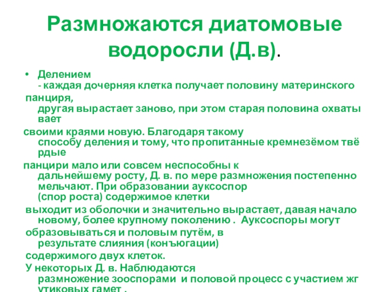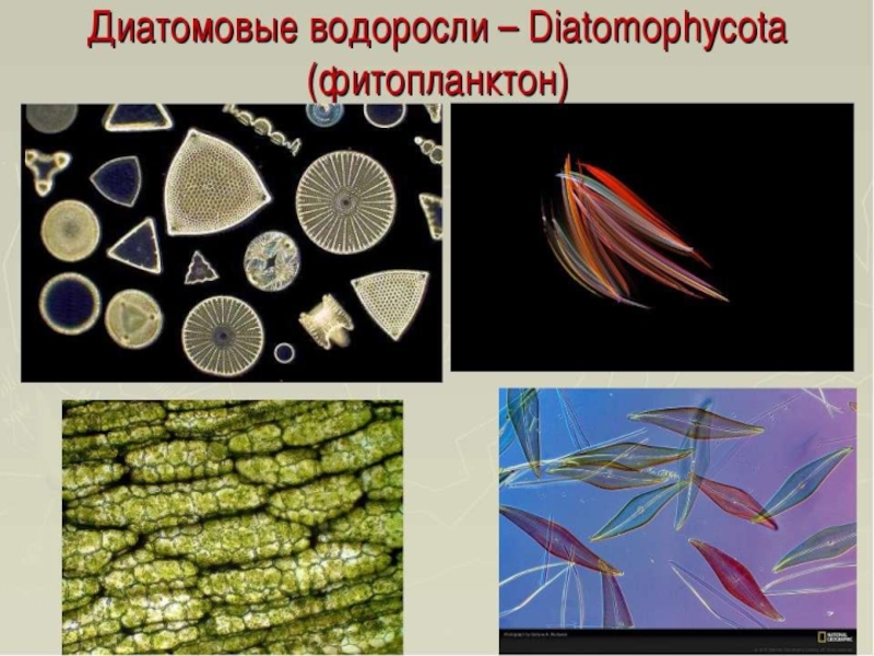 Диатомовые водоросли.Диатомовые водоросли. Диатомеи (от греч. diátomos — разделённый пополам),кремнистые водоросли (Bacillariophyta), отдел (тип) водорослей (около 20 тыс. видов). Д. в. микроскопические(0,75—1500 мкм), одноклеточные, одиночные или колониальные формы; среди последних встречаются; виды, живущие в слизистых трубках, образующие бурые кусты высотой до 20см. Клетки Д. в. имеют твёрдый кремнёвый панцирь, состоящий из двух половинок, так называемых створок, находящих одна на другую . Верхнюю створку называют эпитекой, нижнюю —гипотекой. Стенки панциря имеют поры, через которые осуществляется обмен веществ с внешней средой.