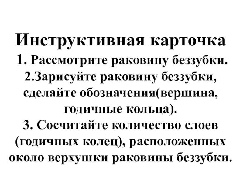 Слайд 4Инструктивная карточка  1. Рассмотрите раковину беззубки. 2.Зарисуйте раковину беззубки, сделайте обозначения(вершина, годичные кольца). 3.