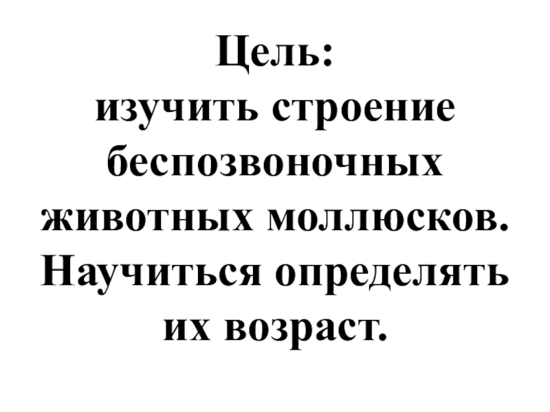Слайд 2Цель:  изучить строение беспозвоночных животных моллюсков. Научиться определять их возраст.