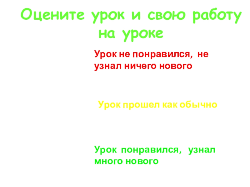 Оцените урок и свою работу на урокеУрок не понравился, не узнал ничего новогоУрок прошел как обычноУрок понравился,