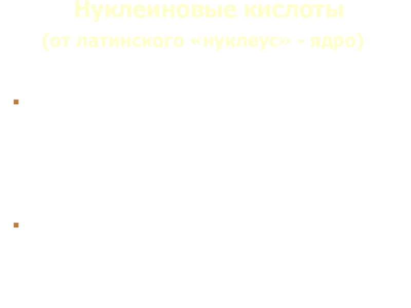 Нуклеиновые кислоты Их роль:Ответственны за хранение и передачу наследственных признаков от родителей потомствуВходят в состав хромосом, расположенных