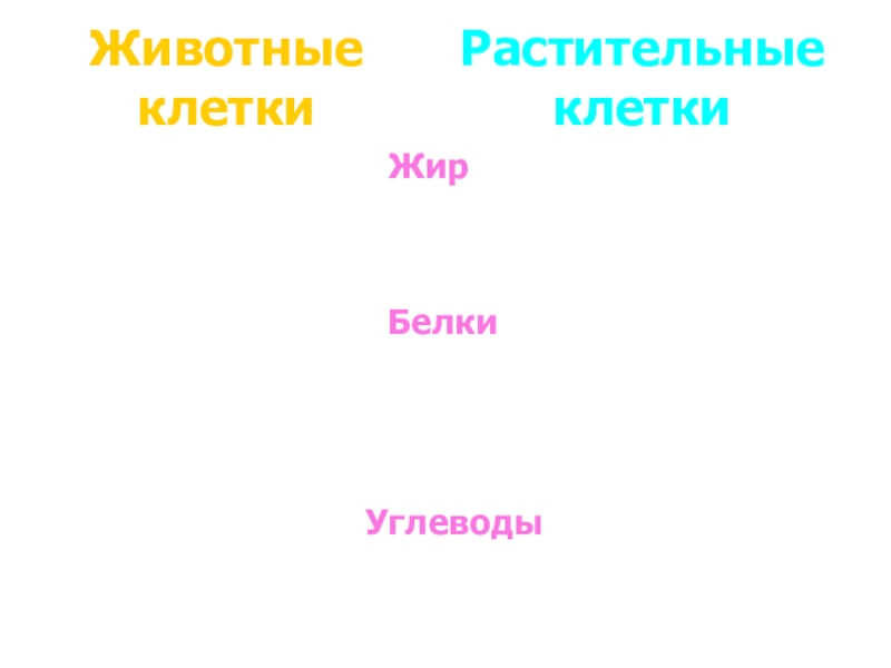 Животные клеткиРастительные клеткиЖирРастительный жир(подсолнечное масло)Животный жир(сыр)БелкиБелок гемоглобинаСояУглеводыГлюкоза,сахарозаКлетки печени