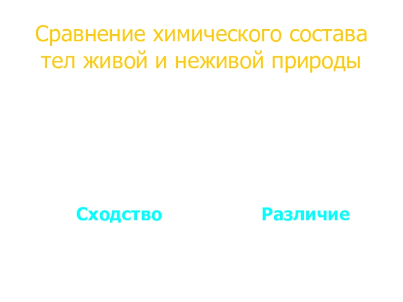 Сравнение химического состава тел живой и неживой природыРазличие На уровне химическихсоединенийСходство  На уровне химических элементов