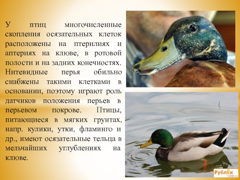 Слайд 17У птиц многочисленные скопления осязательных клеток расположены на птерилиях и аптериях