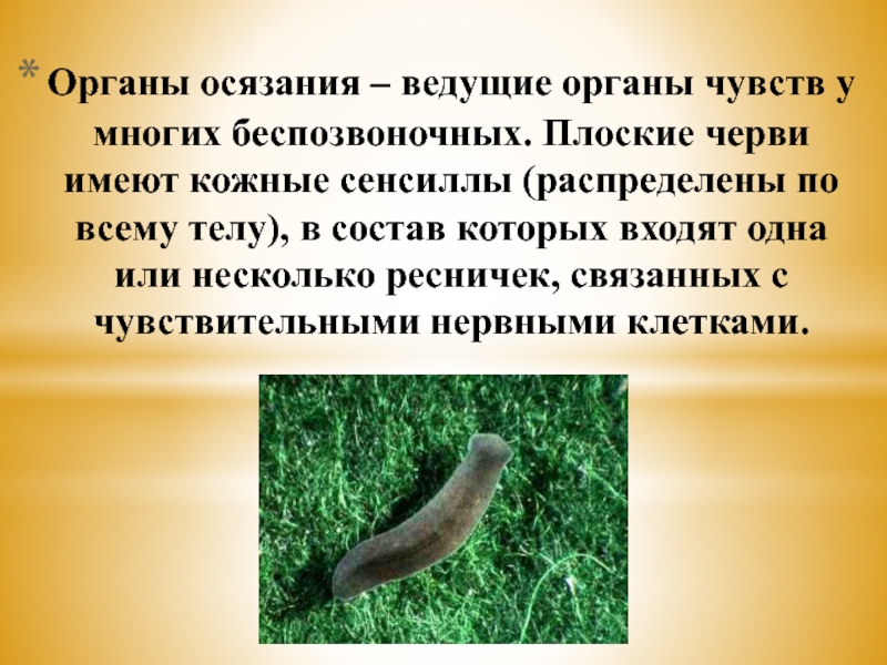Слайд 3Органы осязания – ведущие органы чувств у многих беспозвоночных. Плоские черви