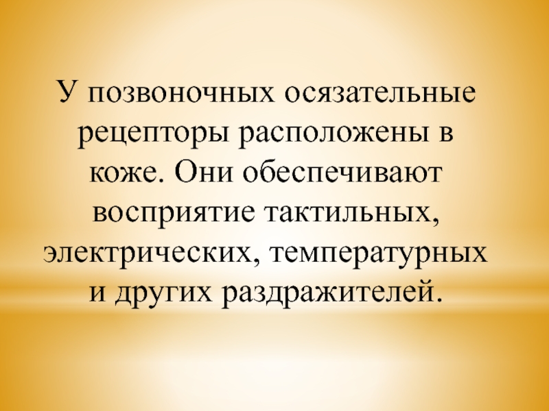 Слайд 11У позвоночных осязательные рецепторы расположены в коже. Они обеспечивают восприятие тактильных,