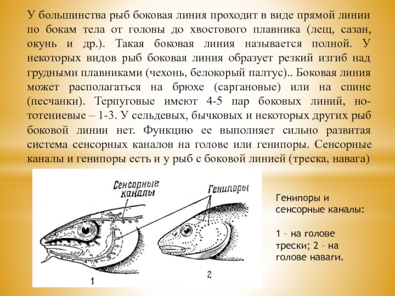 бокам тела от головы до хвостового плавника (лещ, сазан, окунь и др.). Такая боковая линия называется полной. У некоторых видов рыб боковая линия образует резкий изгиб над грудными плавниками (чехонь, белокорый палтус).. Боковая линия может располагаться на брюхе (саргановые) или на спине (песчанки). Терпуговые имеют 4-5 пар боковых линий, но-тотениевые – 1-3. У сельдевых, бычковых и некоторых других рыб боковой линии нет. Функцию ее выполняет сильно развитая система сенсорных каналов на голове или генипоры. Сенсорные каналы и генипоры есть и у рыб с боковой линией (треска, навага)