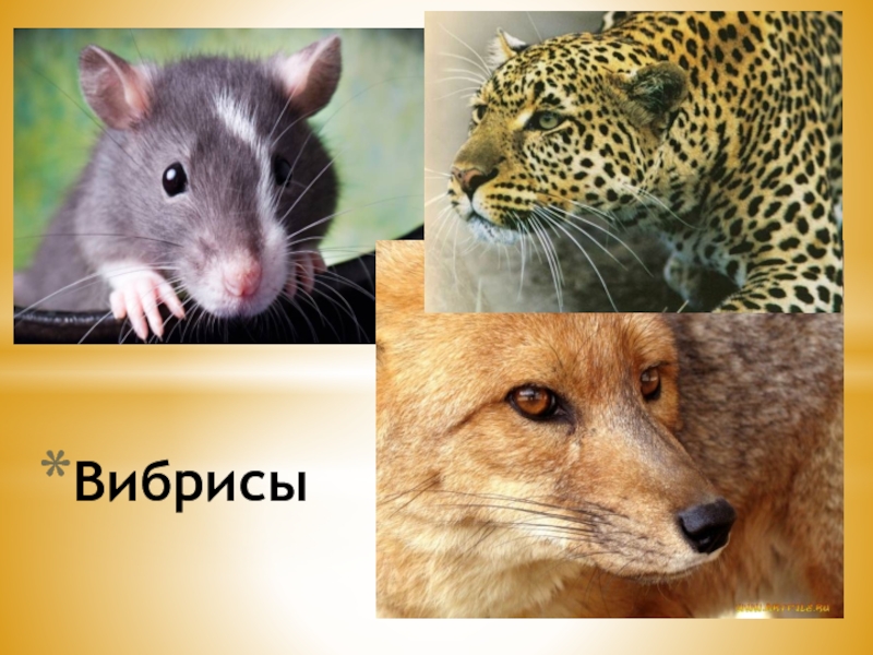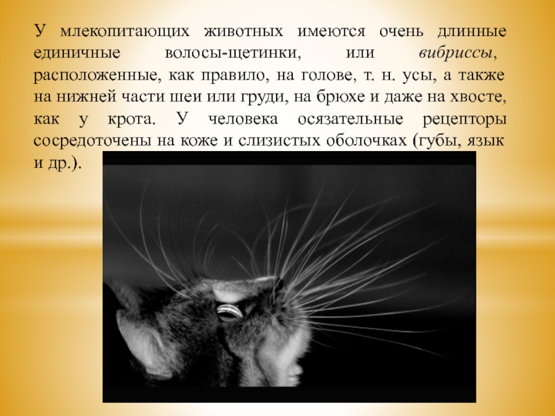 Слайд 18У млекопитающих животных имеются очень длинные единичные волосы-щетинки, или вибриссы, расположенные,