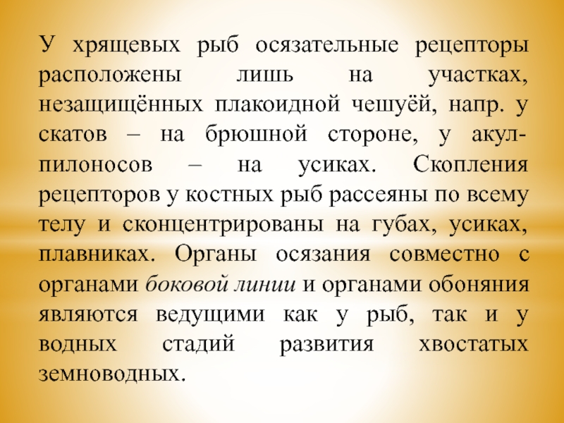 чешуёй, напр. у скатов – на брюшной стороне, у акул-пилоносов – на усиках. Скопления рецепторов у костных рыб рассеяны по всему телу и сконцентрированы на губах, усиках, плавниках. Органы осязания совместно с органами боковой линии и органами обоняния являются ведущими как у рыб, так и у водных стадий развития хвостатых земноводных.