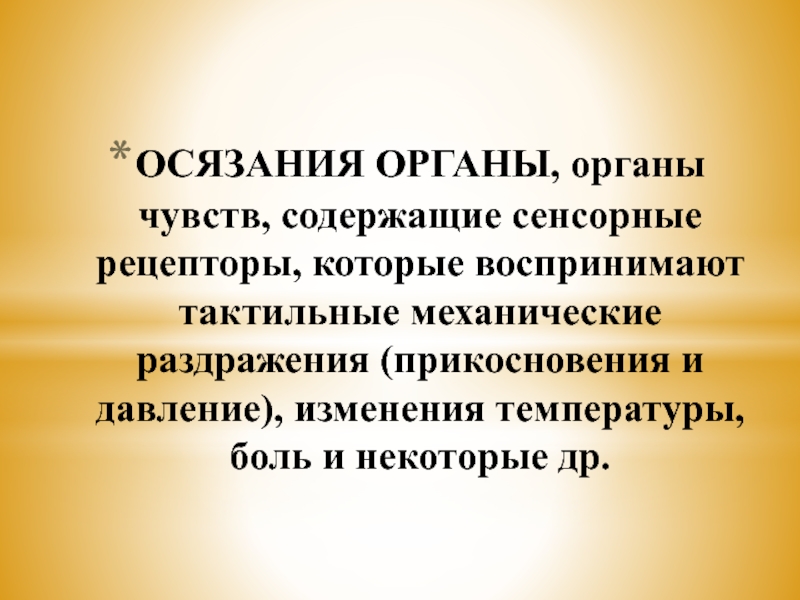 Слайд 2ОСЯЗАНИЯ ОРГАНЫ, органы чувств, содержащие сенсорные рецепторы, которые воспринимают тактильные механические