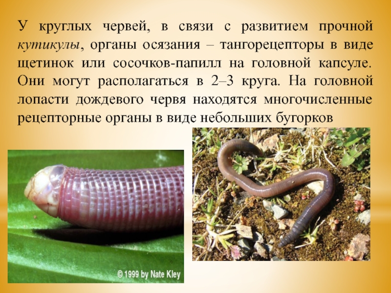 Слайд 4У круглых червей, в связи с развитием прочной кутикулы, органы осязания